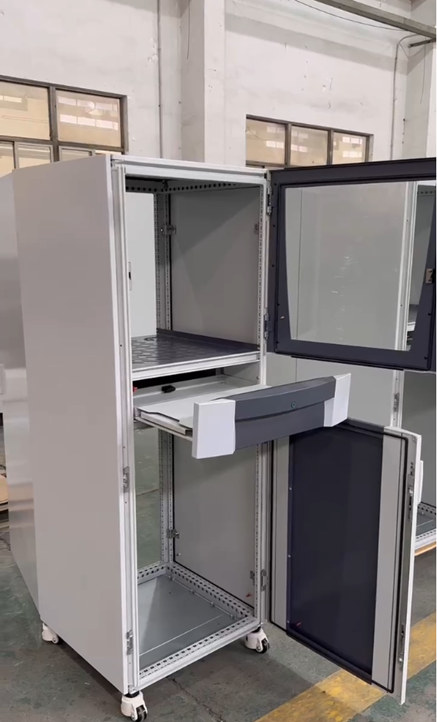 标准配置:柜体、后门板、前上玻璃门、前下钢板门、键盘抽屉、密封条、层板、门锁、脚轮(可选)