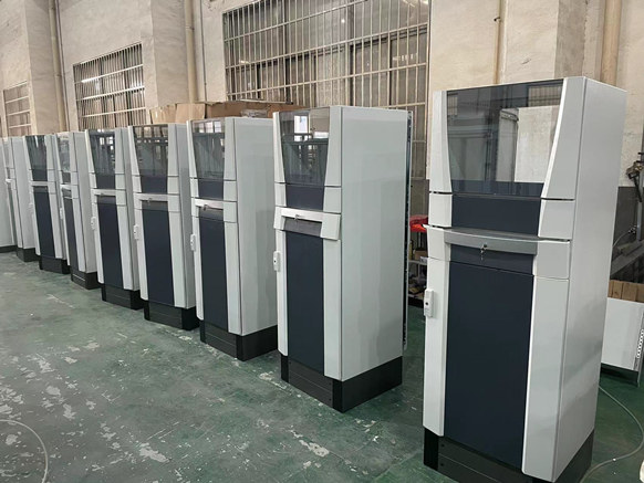 表面处理:机柜磷化底涂处理,外部为粉末涂层,颜色RAL7035,装饰条RAL5018两种织纹,层板与柜体同色